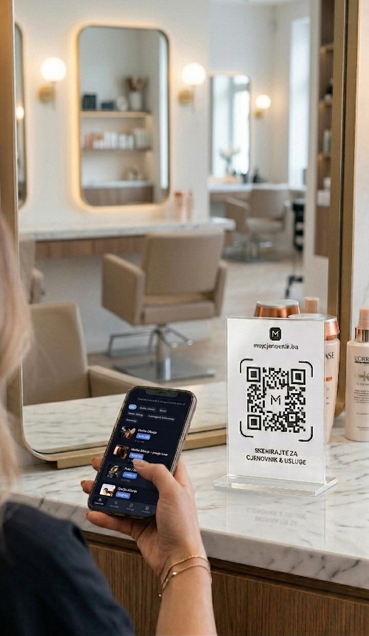 Najveći strah svakog klijenta u BiH je "iznenađenje na kasi". Koliko puta ste čuli: "Mislila sam da će biti 50, a ispalo je 90 KM"? Kada klijent može skenirati QR kod na ogledalu i u miru, dok mu "prima boja", pogledati cijene svih dodatnih tretmana (maske, preljevi, ampule), on se osjeća sigurno. Transparentnost uklanja barijeru između vas i klijentovog novčanika. Digitalni cjenovnik omogućava klijentu da istražuje vaše usluge bez pritiska da vas mora pitati za svaku sitnicu.